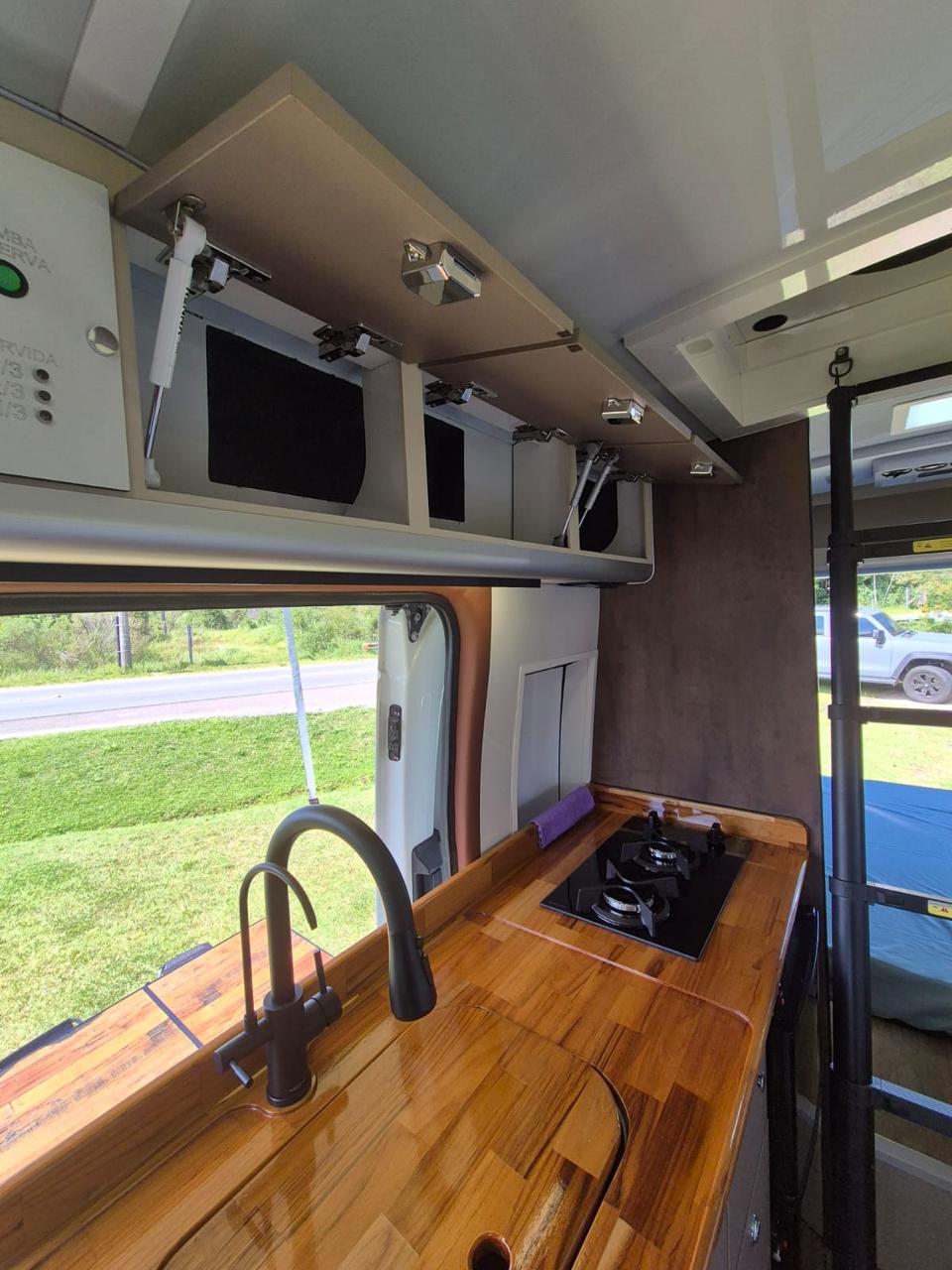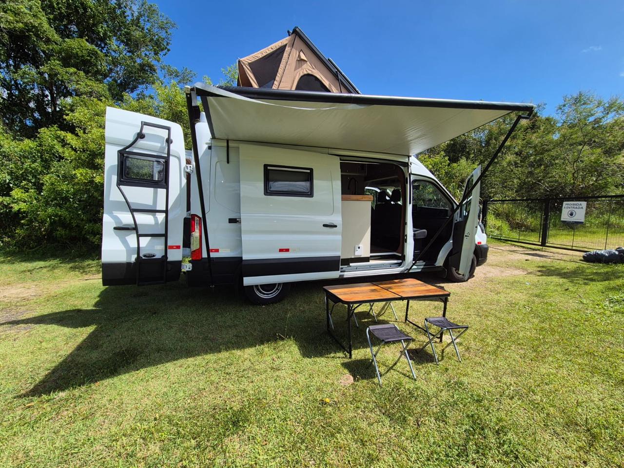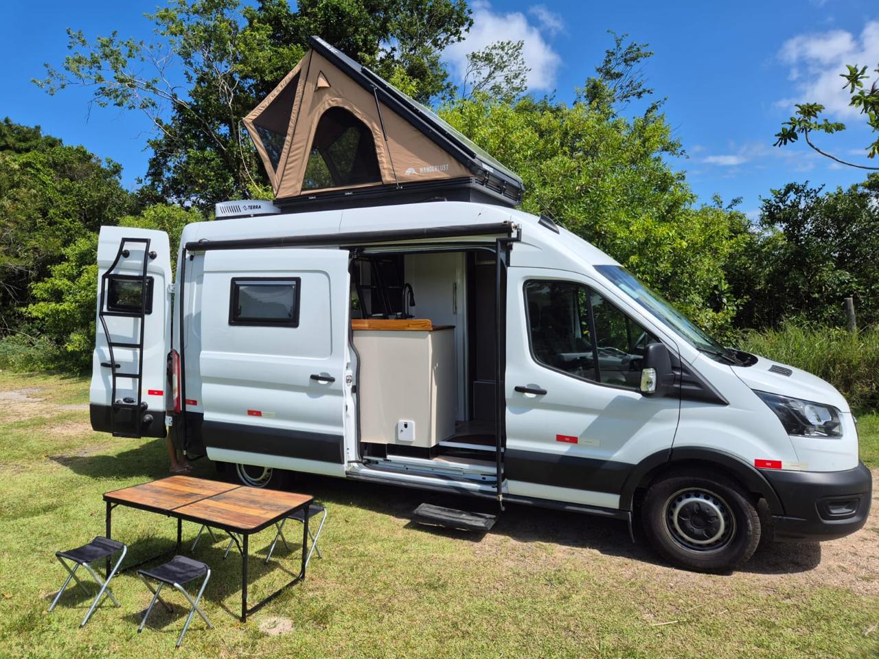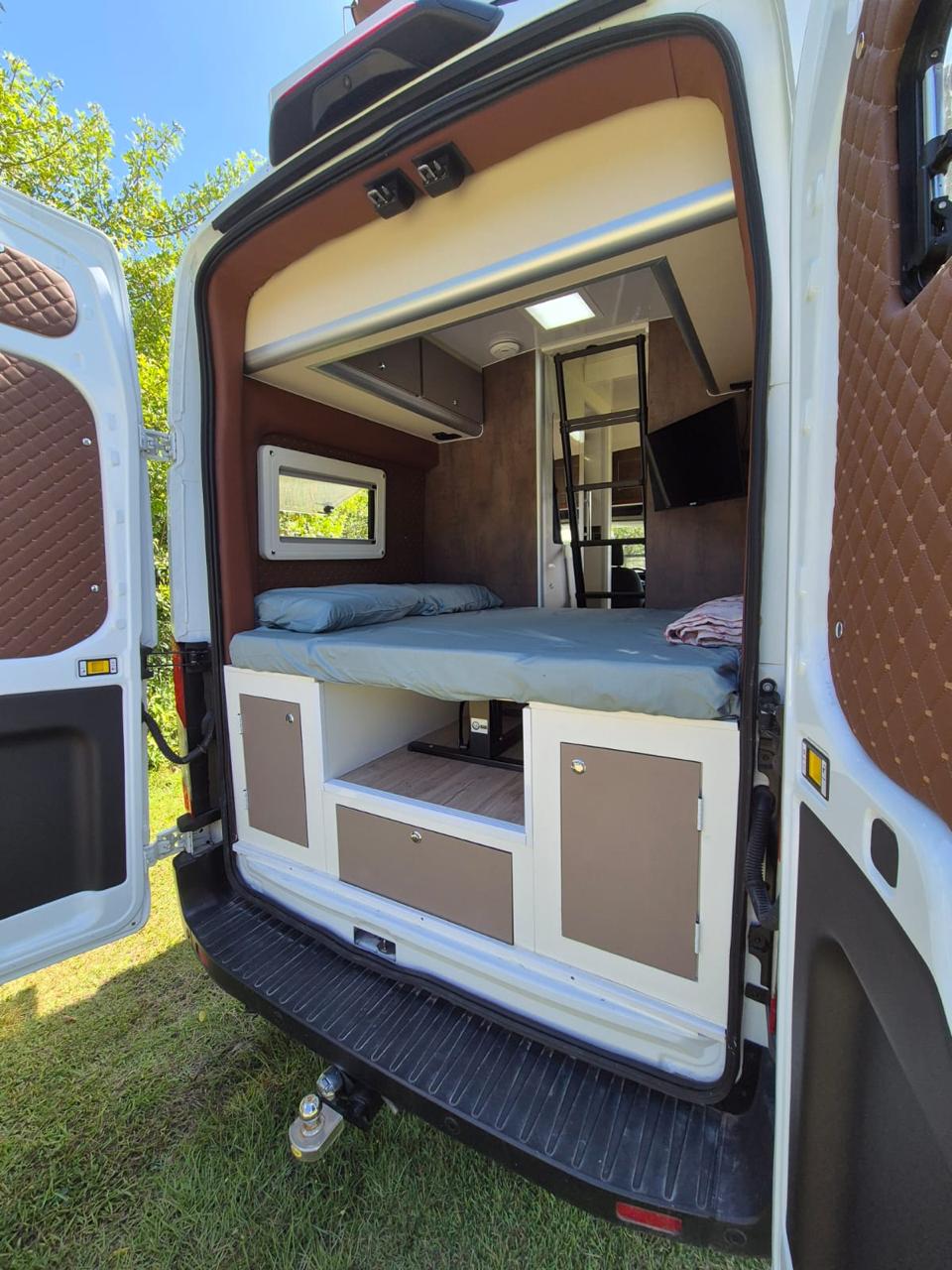 Um Motorhome de classe, com móveis revestidos e ótimo espaço no bagageiro. Possui barraca de teto que acomoda 2 adultos e um quarto de casal que vira sala de estar. Equipamento completo para você não passar perrengue.