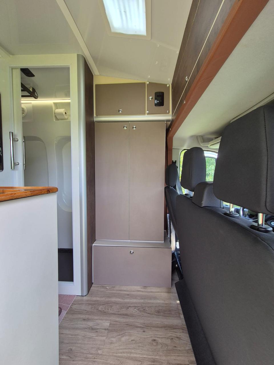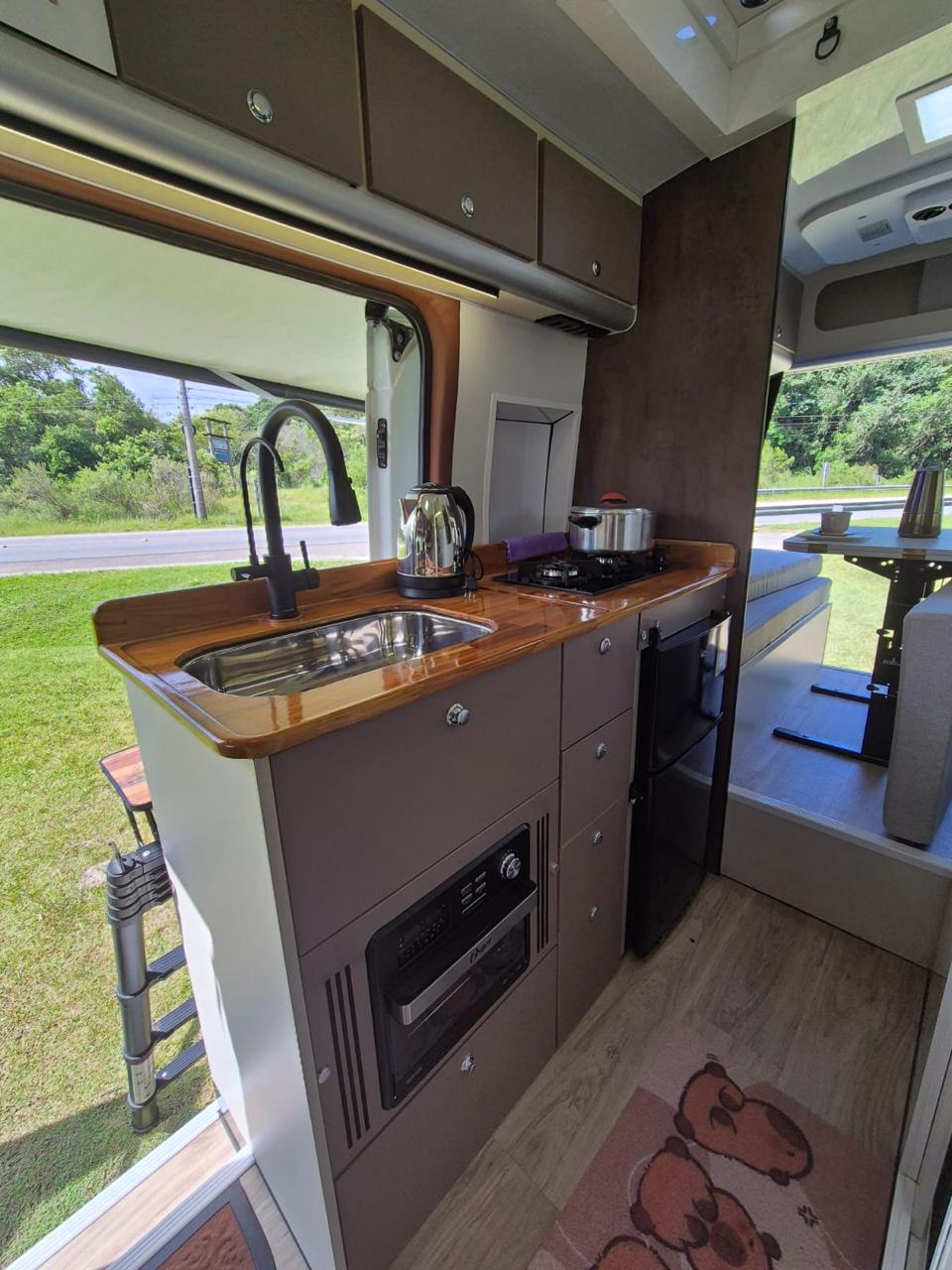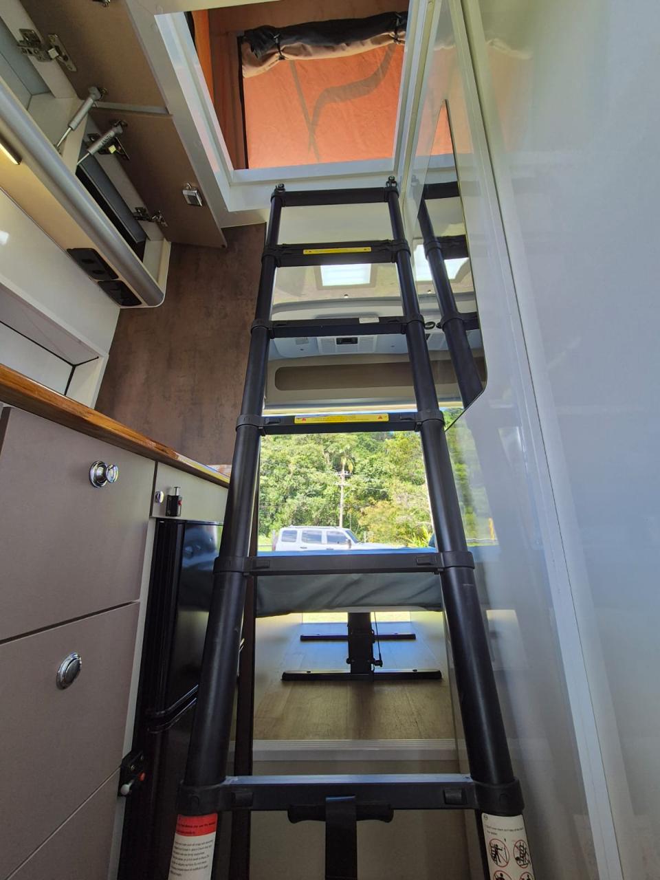 Um Motorhome de classe, com móveis revestidos e ótimo espaço no bagageiro. Possui barraca de teto que acomoda 2 adultos e um quarto de casal que vira sala de estar. Equipamento completo para você não passar perrengue.